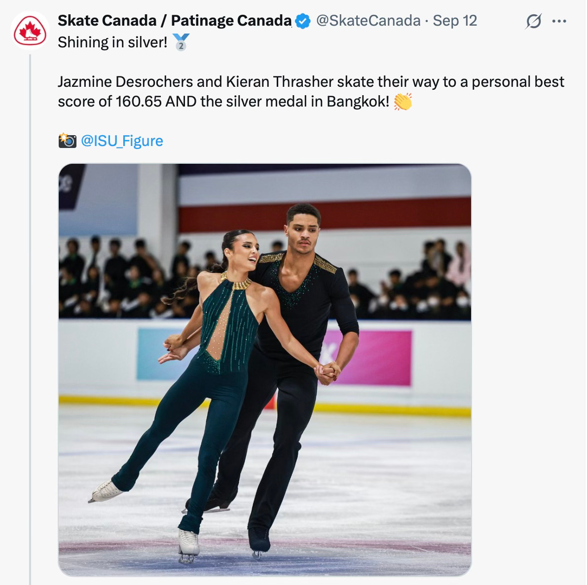 And now, there’s even more. Desrochers and Thrasher made their JGP season debut this weekend in Bangkok, Thailand, and emerged from the competition with a silver medal. The duo, who are coached by Bruno Marcotte at Skate Oakville west of Toronto, also turned in a personal best overall score of 160.65, finishing 2.38 behind gold medallists Rui Guo and Yiwan Zhang of China.