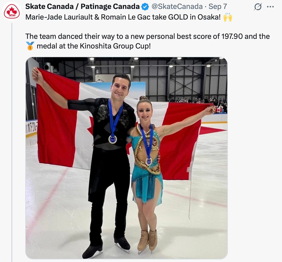 Start at the end of July, when Lauriault and Le Gac earned a silver medal at the Lake Placid Ice Dance International. They were golden in early August at the Quebec summer competition. But the real statement came last weekend, when the couple struck gold again at Kinoshita Group Cup, a Challenger Series event in Osaka, Japan, and produced major personal best scores across the board (76.40 for the rhythm dance, 121.50 for the free dance and 197.90 overall. The latter score would have placed them eighth at Boston Worlds).