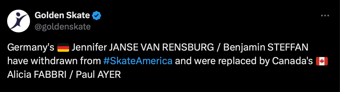 (UPDATE: Due to a withdrawal, Canadian ice dancers Alicia Fabbri and Paul Ayer have been added to the field at Skate America. They will also compete at Skate Canada International).