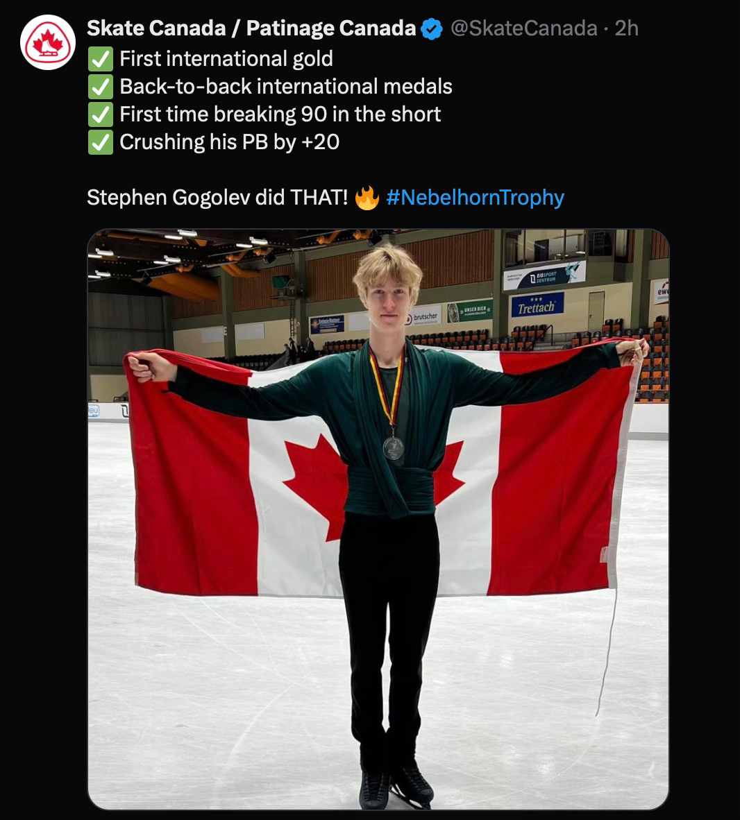 Turns out Gogolev was just warming up. First, he turned in a personal best score of 90.19 in winning the short program at Nebelhorn Trophy in Oberstdorf, Germany. Then it was another PB (164.87) in topping the field in the free program, all of which produced a gold-medal winning total of 255.06 — his first victory at a Challenger Series event. The overall total is his highest since that JGP Final back in 2018.