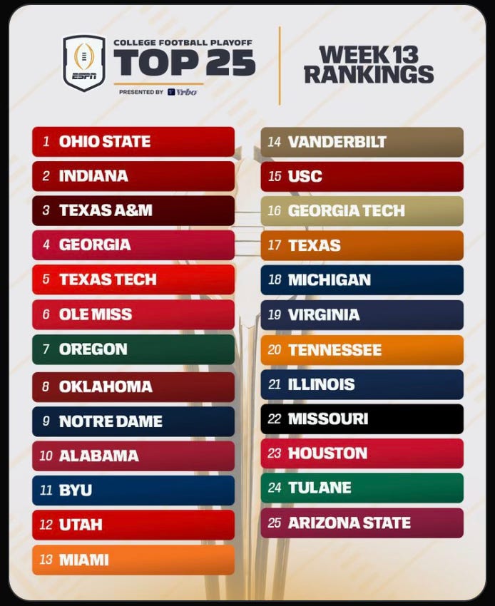 The story for the longest time about the Big Ten and the playoff has been this: Ohio State and Indiana, who have been 1-2 in everybody’s rankings for about a month now, are virtual locks for the CFP. Oregon is next in line and then … that’s where the talk ends. But there are a few games over the final two weekends of the regular season that might throw a monkey wrench into those plans. First off is USC’s visit to Oregon this Saturday, which is most likely the Trojans’ last stand in terms of having a shot at the playoff. But should they pull off the upset, that could be bad news for Michigan, whose 8-2 record this season includes a loss to USC. Now, what if the Wolverines extend their hex over Ohio State on Nov. 29 in Ann Arbor? Might be hard to keep Michigan out with that kind of a win on their resume. So yeah, a few results going a certain way could mess up this picture in some significant ways. Something worth tracking the rest of the way.