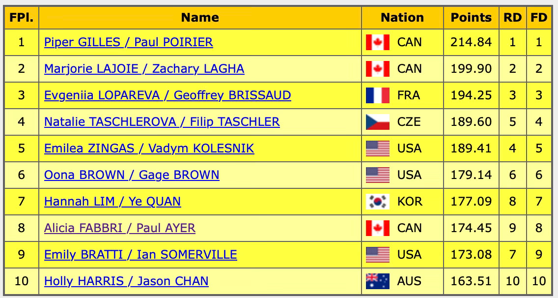 Gilles and Poirier took the gold by a comfortable 14.94-point margin, with Lajoie and Lagha 5.65 points in front of France’s Evgeniia Lopareva and Geoffrey Brissaud. It’s the first 1-2 finish by Canadian ice dancers here since 2017, when Virtue and Moir won gold and Kaitlyn Weaver and Andrew Poje took the silver.
