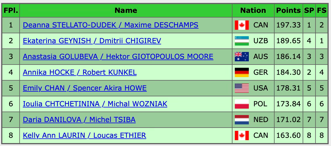 The Canadians’ free program score of 124.10 wasn’t even the best of the night. That honour went to Uzbekistan’s Ekaterina Geynish and Dmitrii Chigerev (126.12), who rose from fourth after the short program to the silver medal position. Stellato-Dudek and Deschamps’ overall total of 197.33 was also well below their personal best (they’ve cracked 200 points on several occasions in the last year).