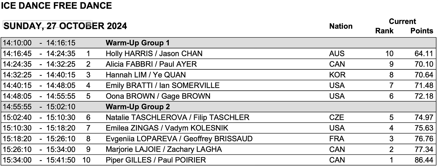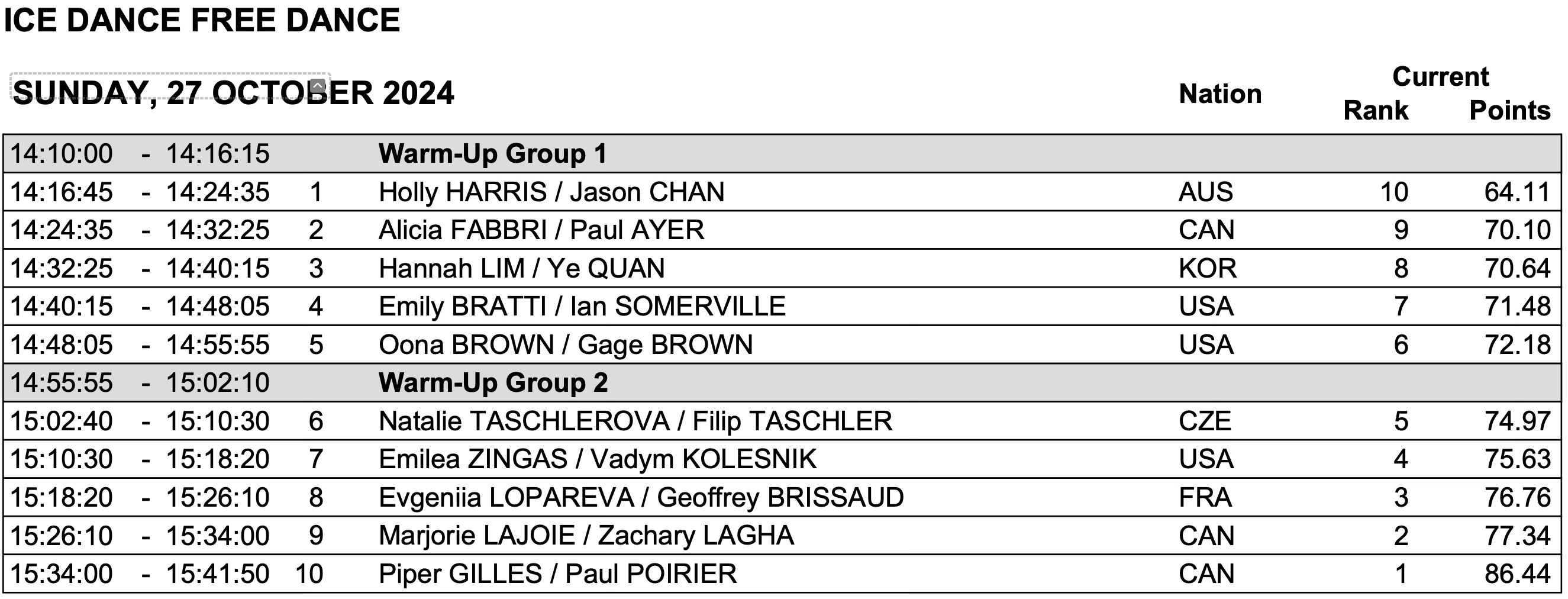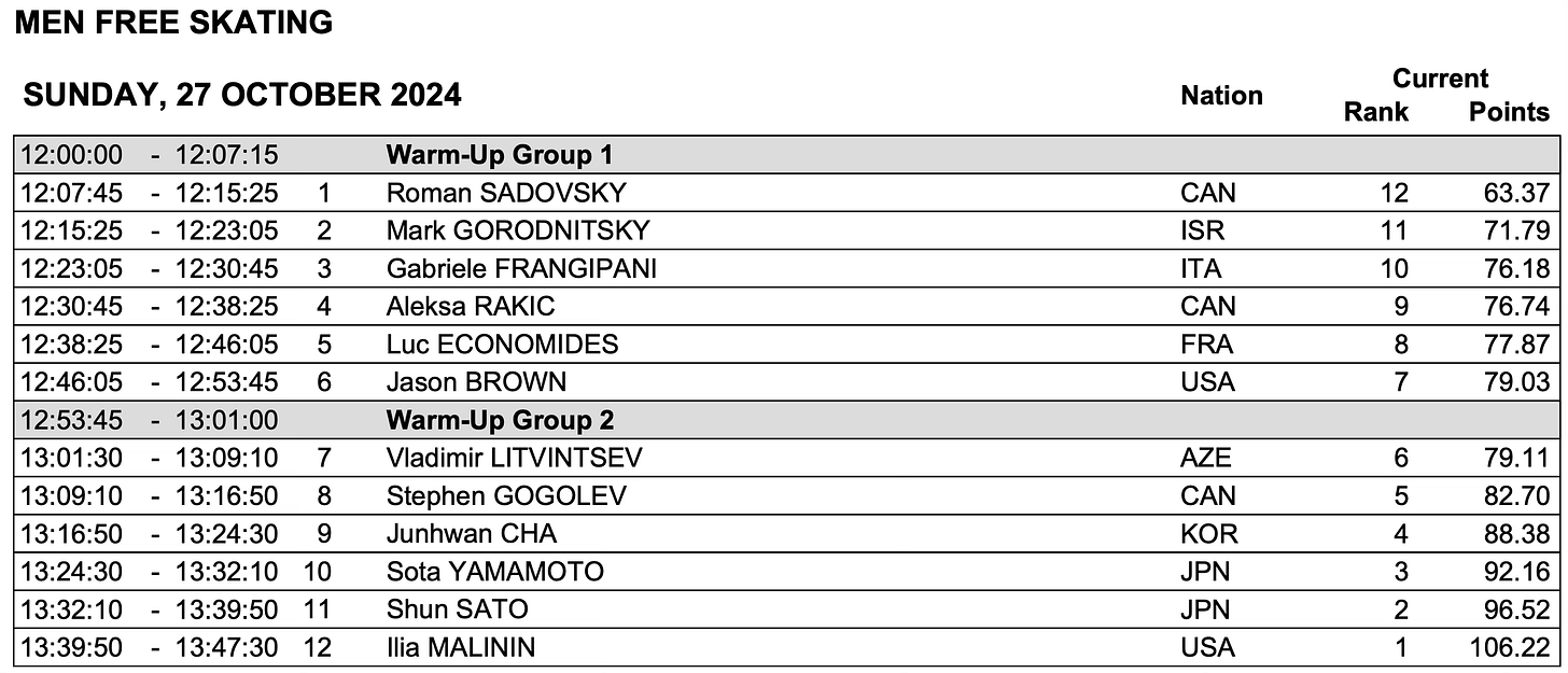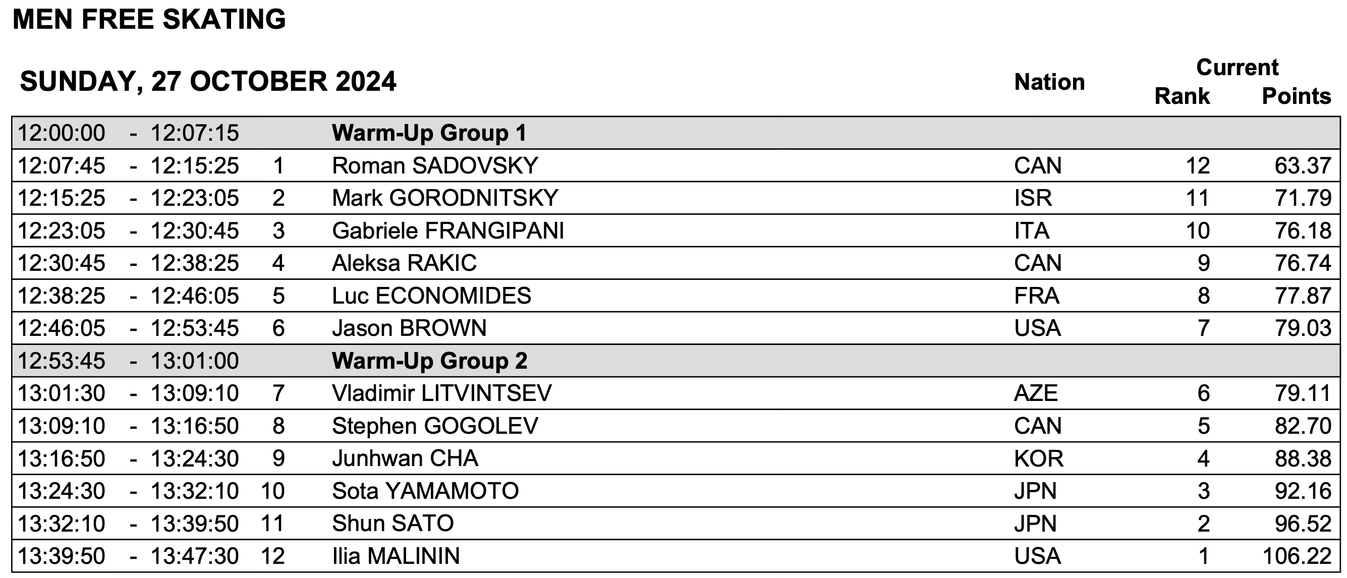 The final day of competition at Scotiabank Centre includes the men’s free skate and free dance, beginning at noon local time. Here’s the start orders and times for those those events: