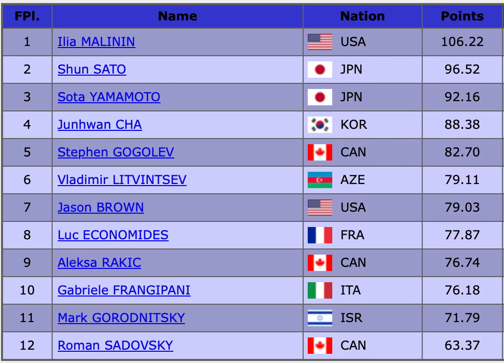 Among the home side, 2024 national silver medallist Aleksa Rakic stands ninth (76.74), while Roman Sadovsky finds himself back in 12th spot (63.37).