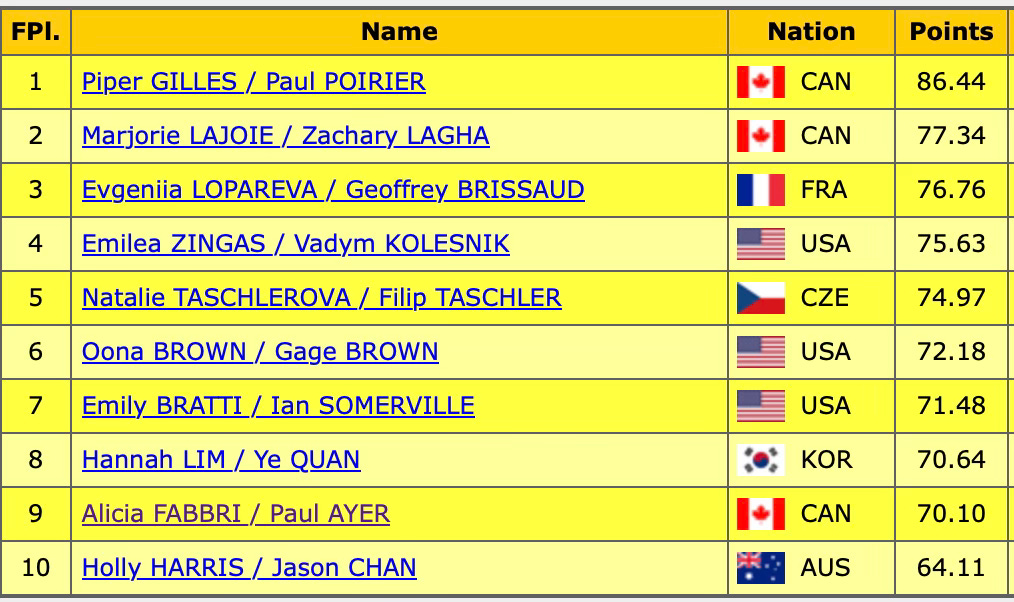 Canada’s third team at the event, Alicia Fabbri and Paul Ayer, stands ninth heading into Sunday’s free dance, which will close out the competition on Sunday. It’s their second of back-to-back Grand Prix events, after having been late additions to the field at Skate America, where they placed 10th.
