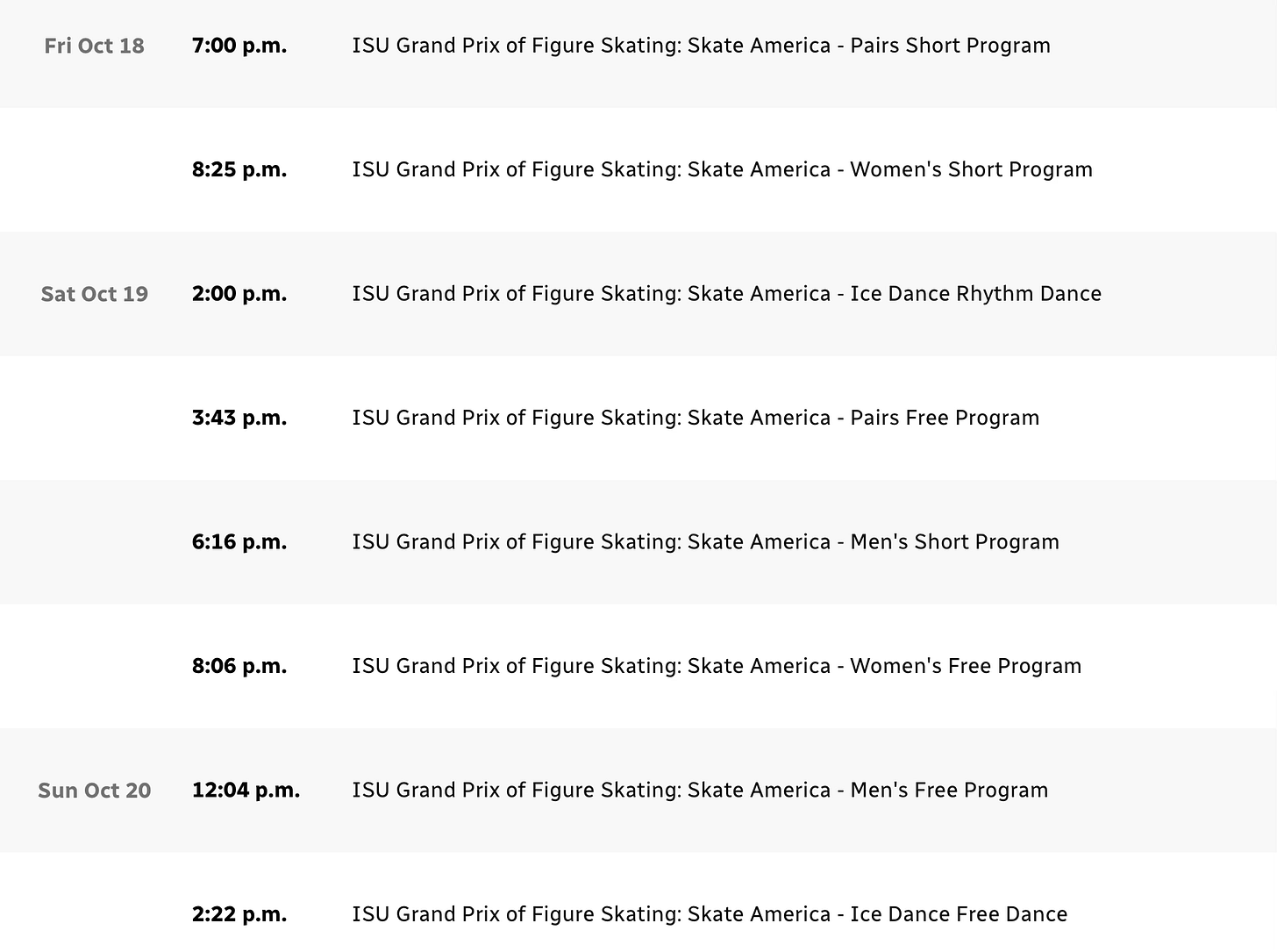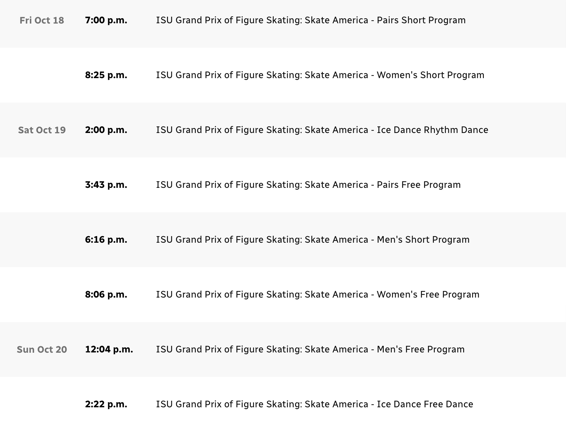 Meanwhile, CBC’s Grand Prix streaming schedule launches this weekend from Skate America in Texas. Here’s when to watch (all times Eastern):