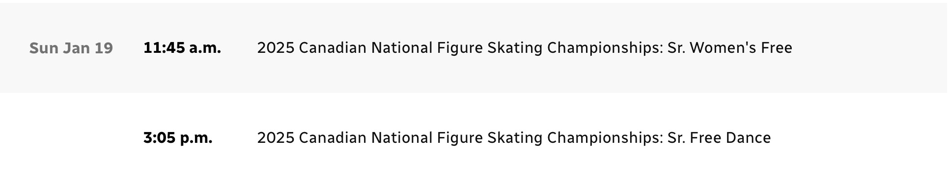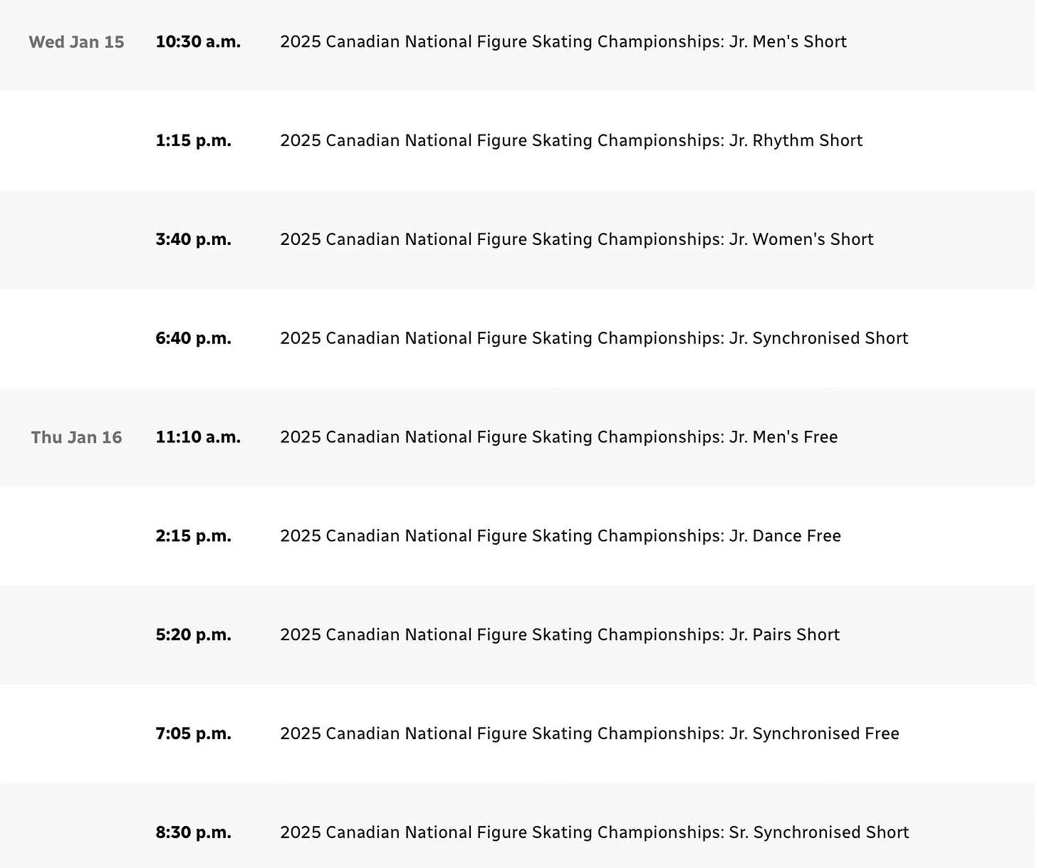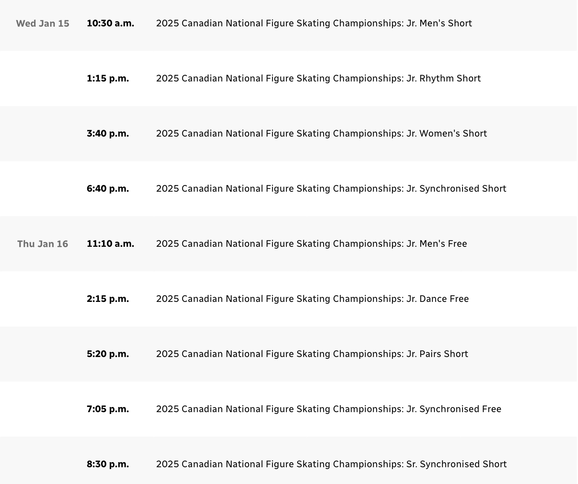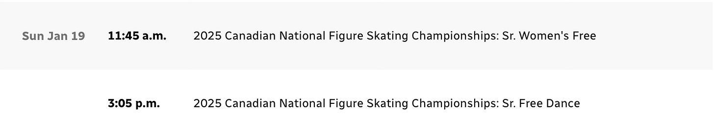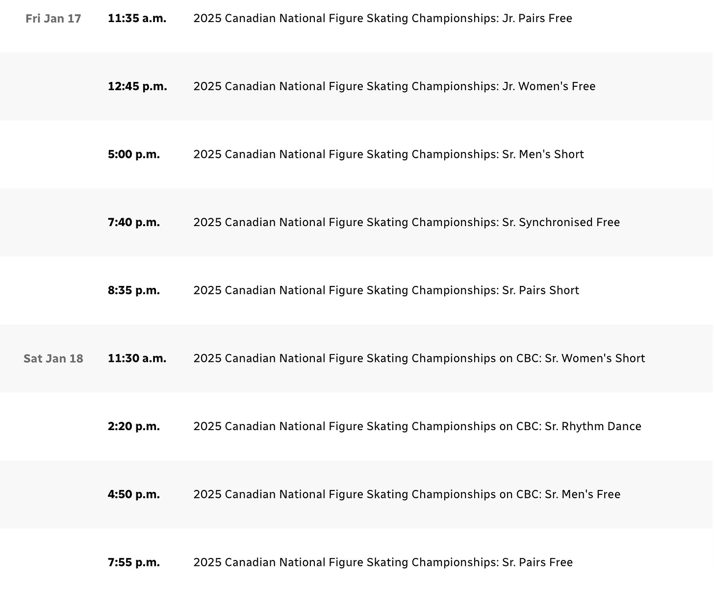 More than 330 senior and junior skaters are headed to Laval next week for the national championships. It all gets started on Wednesday and runs through Sunday, Jan. 19. Here’s the schedule of events, with all of this being streamed live through Skate Canada’s website and CBC Gem.