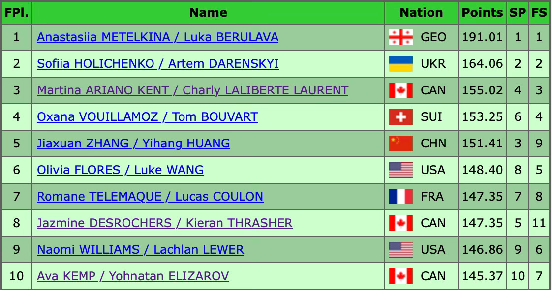 Ariano Kent and Laliberte Laurent, who are based in Chambly, Quebec, came into Junior Worlds as the least heralded of Canada’s three entries based on this season’s results, but got the job done when it counted and improved their finish by two places over 2024 Junior Worlds. Back in January, they were silver medallists at the Canadian Championships behind Winnipeg’s Ava Kemp and Yohnatan Elizarov, who came into this event ranked No. 2 in the world standings but wound up 10th overall (145.37). They had been sixth in two previous tries at this competition.